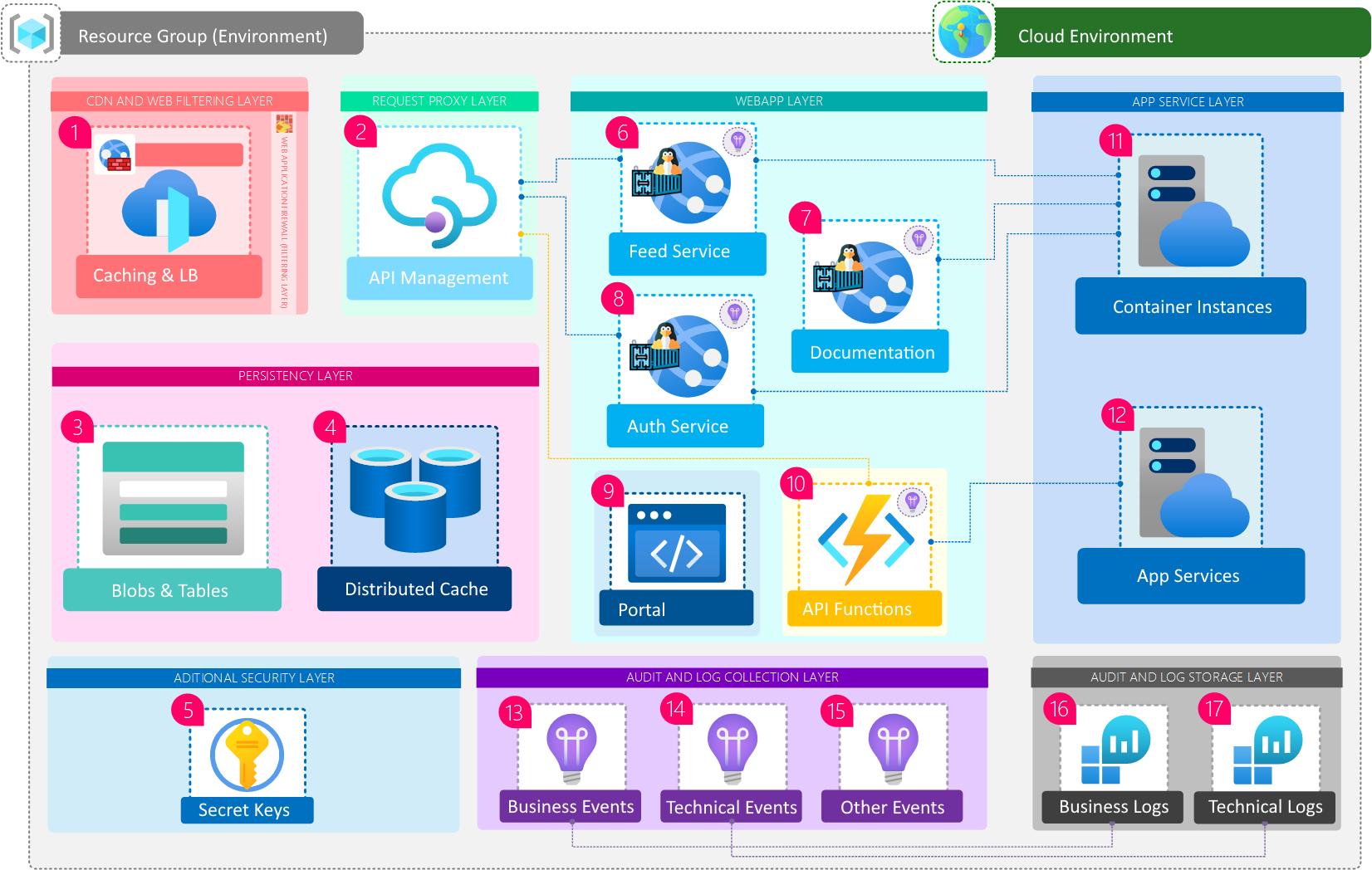 The API Management layer is connected to all container instances (6, 8, 7), as well as the Function-as-a-Service (10) written to support the portal itself. The actual infrastructure hosts these systems in multiple instances (11, 12) to guarantee optimal response times.